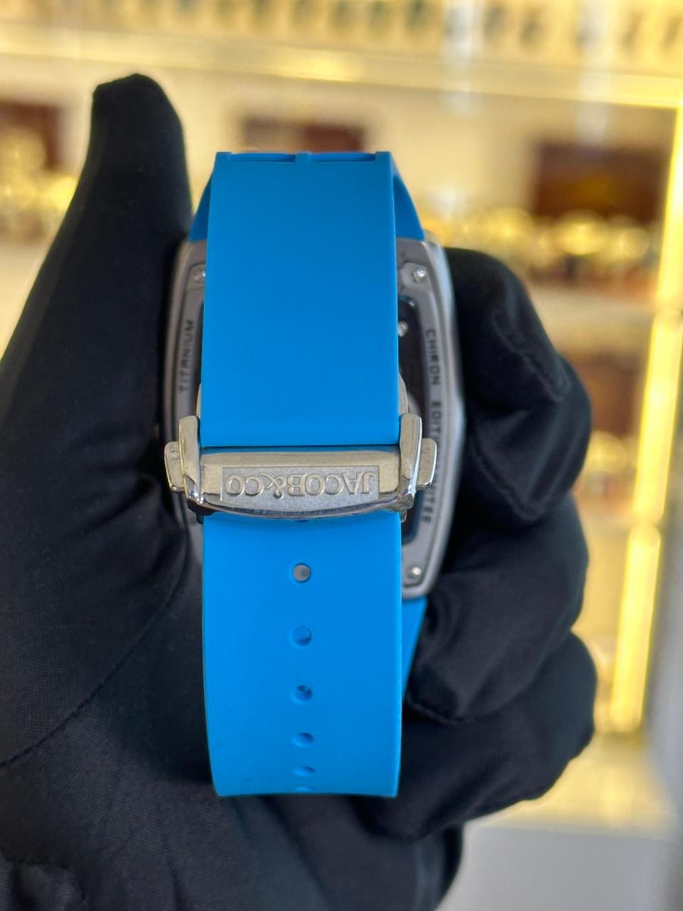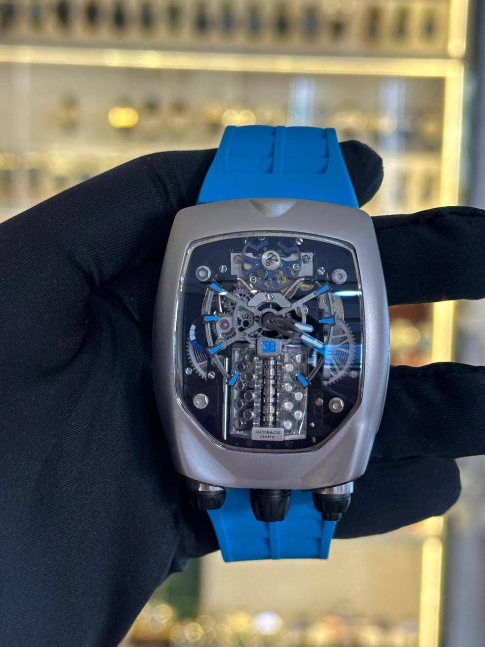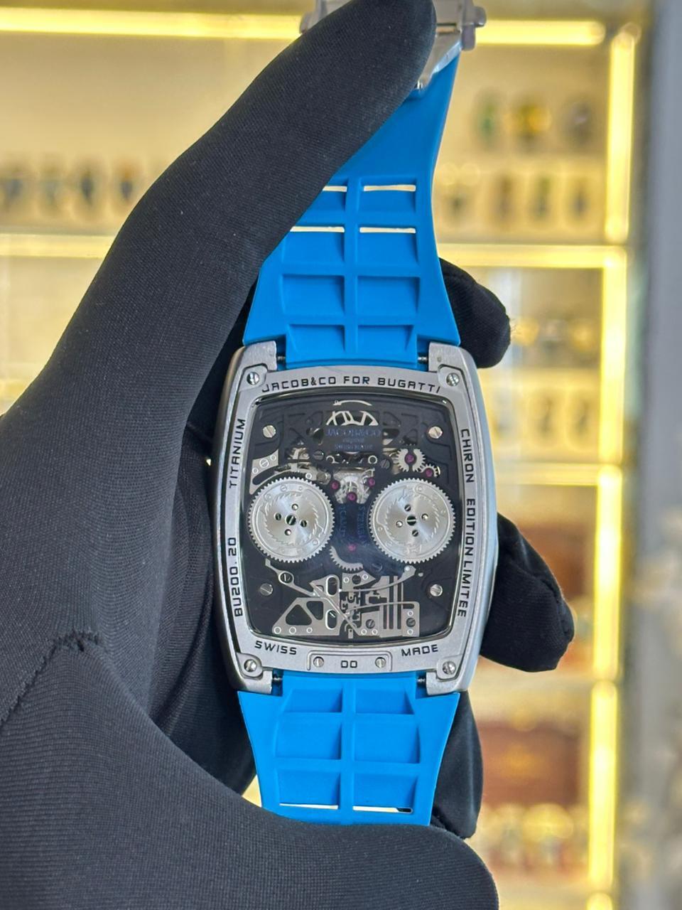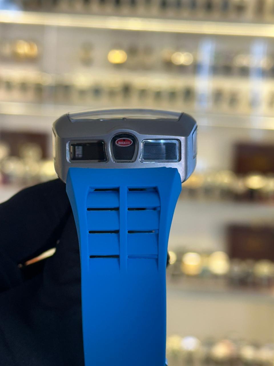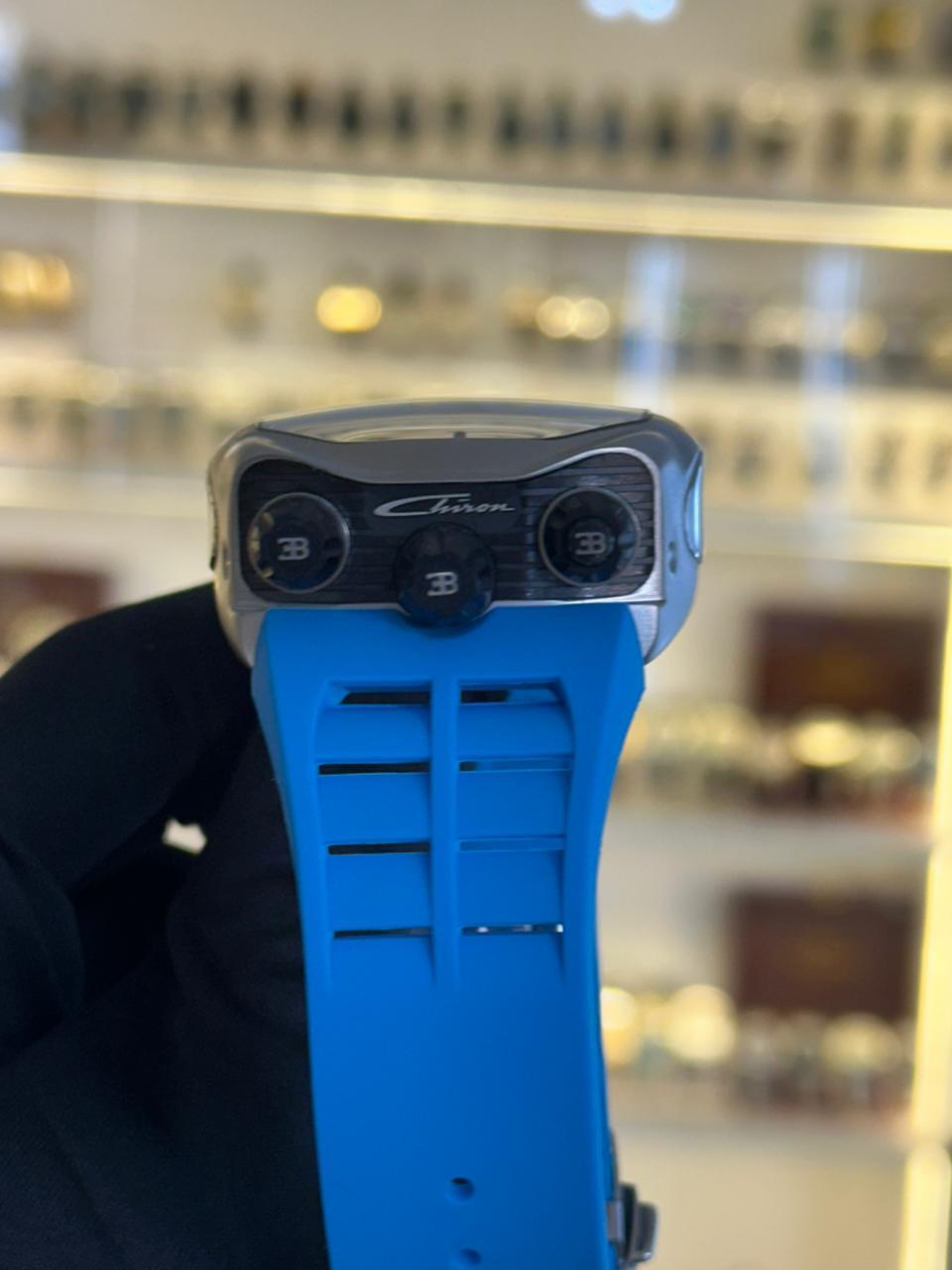 Case: Blue PVD stainless steel, 54 x 44 mm, shaped like the Bugatti W16 engine block